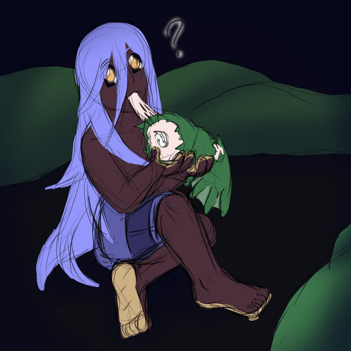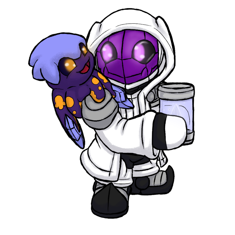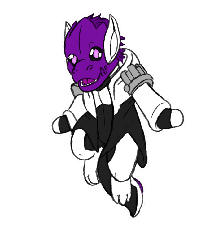 A simple, unshaded, chibi-stylized drawing of a character with a white outline.Could work as stickers for places like Telegram and Discord.